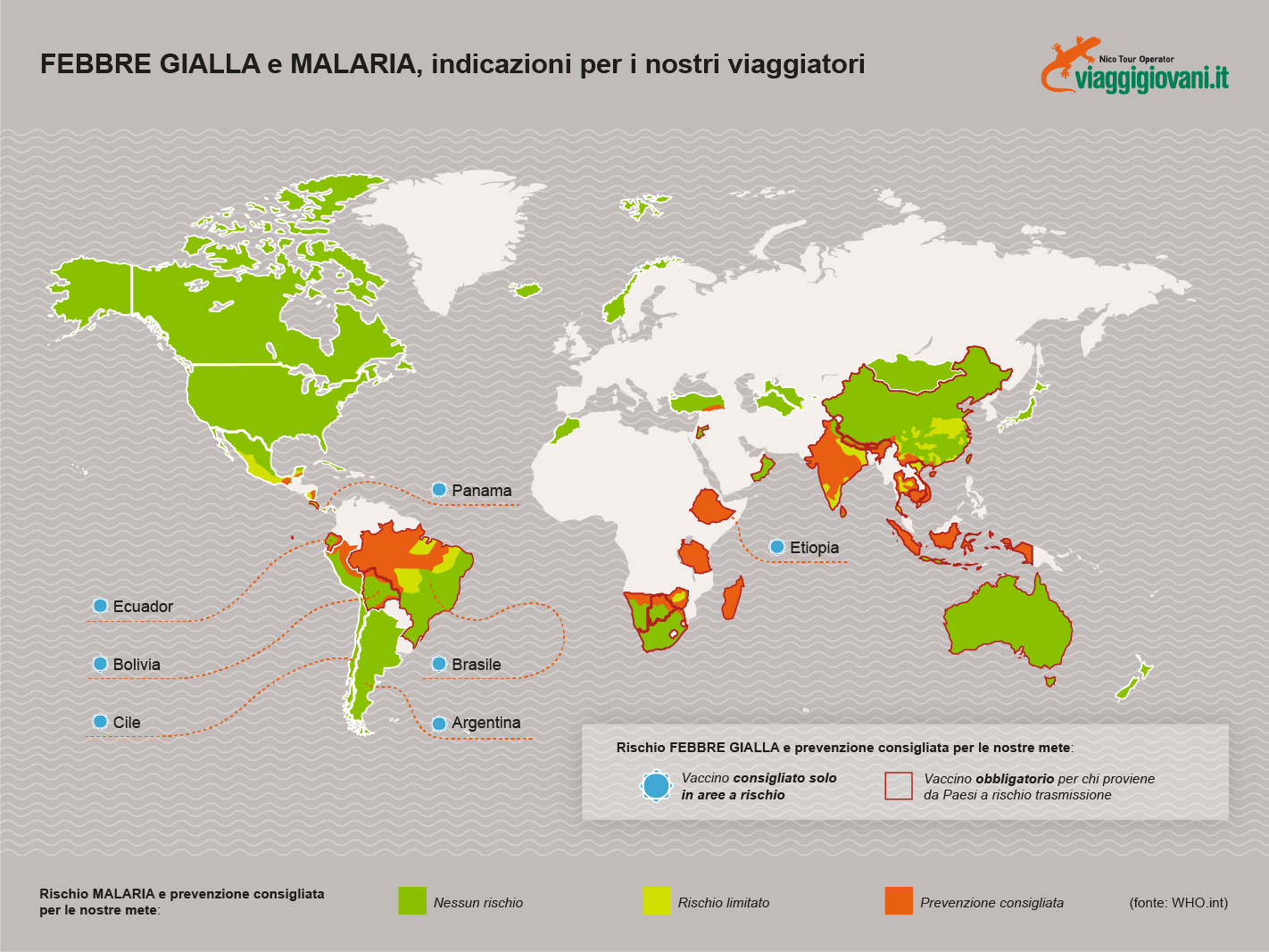 Infografica vaccinazione antiamarillica e profilassi antimalarica per viaggi internazionali