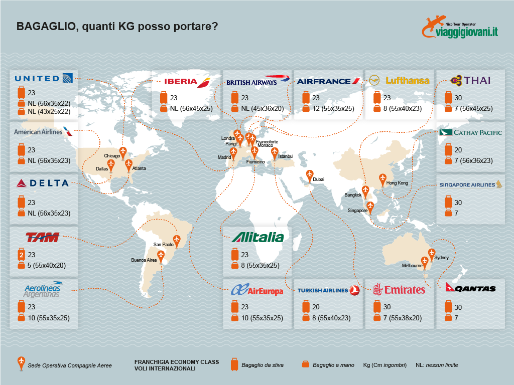 Le regole per il trasporto del bagaglio a mano e da stiva, come ben sappiamo, variano in base alla compagnia aerea prescelta. Per diminuire la confusione sul tema, Viaggigiovani.it ha pensato di rappresentare un'infografica sulle regole in termini di misure e peso delle dimensioni del bagaglio a mano e da stiva delle principali compagnie aeree di linea, che proponiamo nei nostri viaggi.