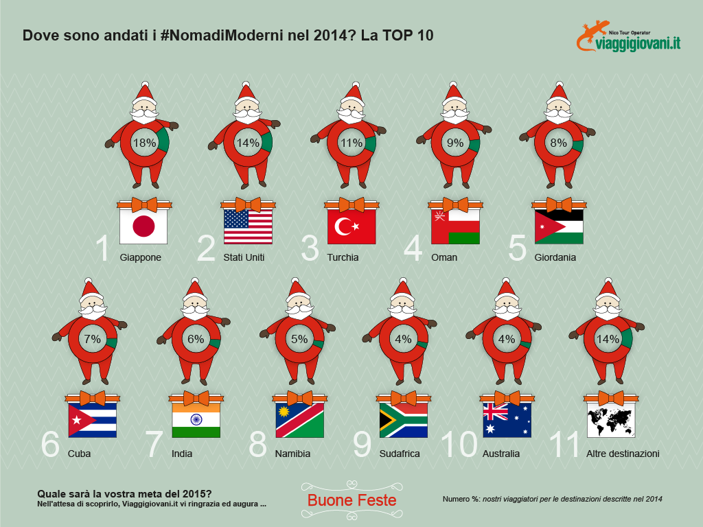 Il Natale e la fine dell’anno sono alle porte; e come sempre è tempo di… classifiche finali! Noi di Viaggigiovani.it abbiamo scelto di prepararne una molto particolare e simpatica, che riguarda tutti i ns viaggiatori. Ecco a voi la “TOP 10” delle destinazioni scelte dai #NomadiModerni nel 2014, naturalmente tutti tour in piccolo gruppo e viaggi su misura targati Viaggigiovani.it. Chi sarà la meta regina del 2014? Scopriamolo assieme (e cercheremo di spiegarvi anche il motivo).