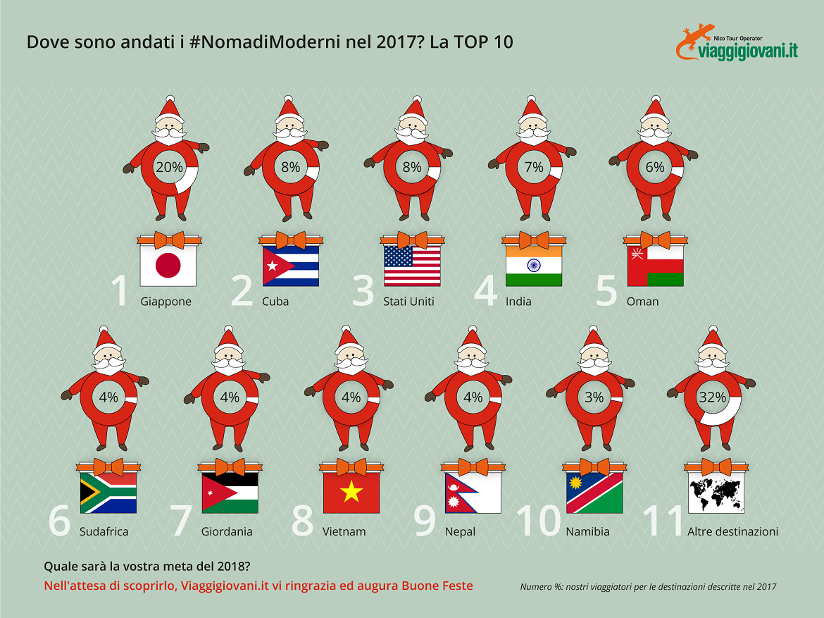 Ricalcando l'infografica "Viaggi 2014, la TOP 10", abbiamo scelto di preparare una classifica molto simpatica, che riguarda tutti i ns viaggiatori. Dove sono andati i #NomadiModerni nel 2017? Quali sono state le mete più gettonate di quest'anno? Sveliamo la “TOP 10”, le destinazioni più scelte dai #NomadiModerni nel 2017, naturalmente tutti tour in piccolo gruppo e viaggi su misura targati Viaggigiovani.it.