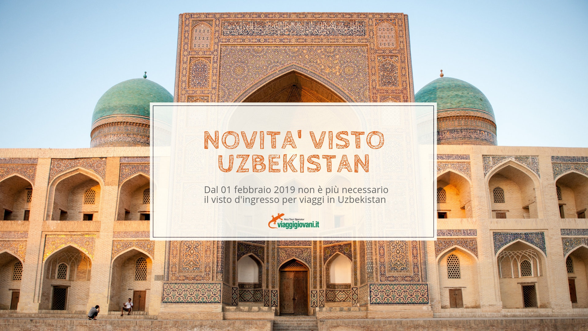 Nuove notizie per tutti i viaggiatori che si recheranno in Uzbekistan: per tutti i cittadini italiani dal 01 febbraio 2019 non è più necessario il visto turistico per viaggi in Uzbekistan; è infatti entrato in vigore il regime senza visto per soggiorni fino a 30 giorni per i cittadini di 45 Stati, Italia inclusa.